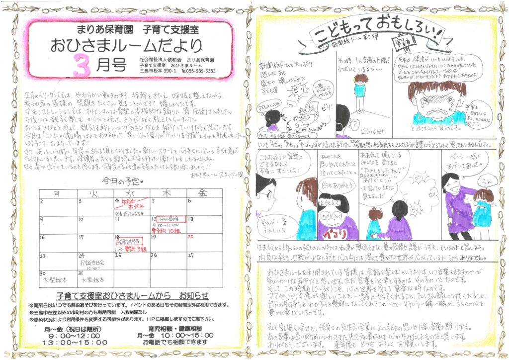 園庭や子育て支援室「おひさまルーム」を開放したり育児相談・健康相談を行なったりしています。